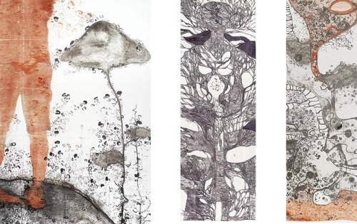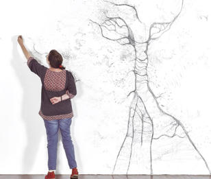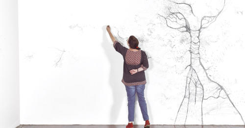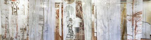 Los paneles siempre los imaginé a través de las distintas texturas de sus materiales y dibujos, como una gran unidad. La forma circular del montaje es parte del ciclo vital y va de la mano con la experiencia que cada uno de los visitantes le aporta. «El bosque huye de los ojos» escribió Ortega y Gasset, se intuyen presencias y ausencias a través de las veladuras y las sombras que proponen los paneles semitransparentes de la instalación. Sobre el término del trayecto se encuentran las siluetas de mis hijos, que ya han atravesado el bosque y continúan avanzando hacia el final de la sala, donde el mural a lápiz Inicio de ciclo, todavía inconcluso, se extiende sobre la pared del museo.Claudia Anselmi